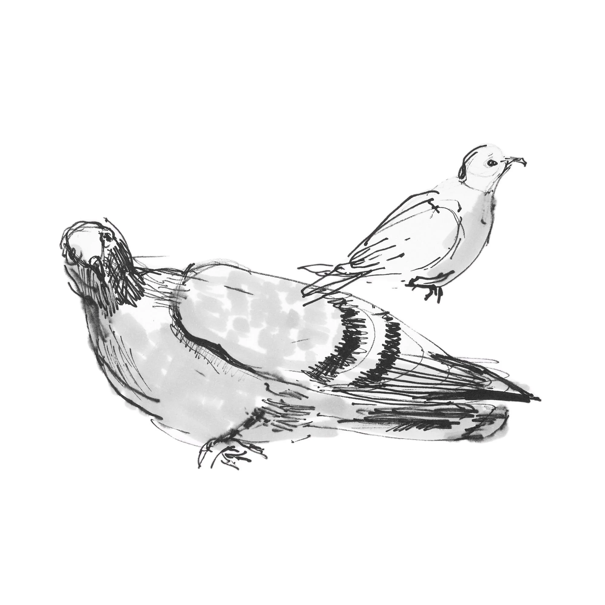 FRIENDS highlights the quirky nature of wood pigeons and the enduring bond they share. This illustration captures the birds' inquisitive behaviour and their deep connection.